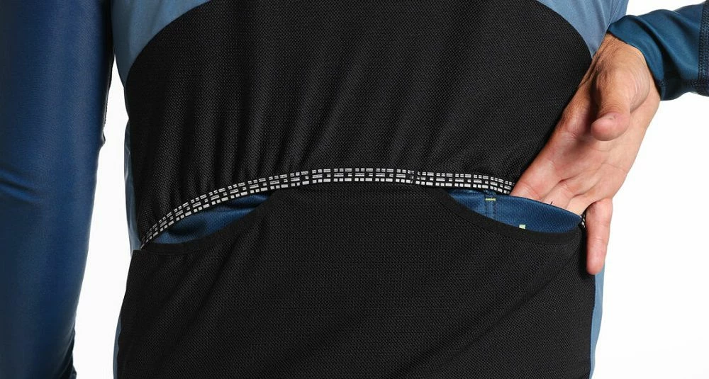Les emmanchures sont finies avec une bordure élastiquée pour aider le gilet à s’adapter près du corps, empêchant l’entrée d’air et augmentant l’aérodynamisme. Dans la zone lombaire, il dispose de 2 ouvertures pour accéder rapidement et facilement aux poches du maillot.